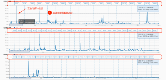 如上方1.4-1與1.4-2兩張圖的對(duì)比,在頻譜分析界面中,新增了頻譜刻度尺自顯示的功能,雙擊后可以同時(shí)看到三軸(徑向水平/徑向垂直/軸向)的邊帶頻以及相關(guān)倍頻數(shù)據(jù)。