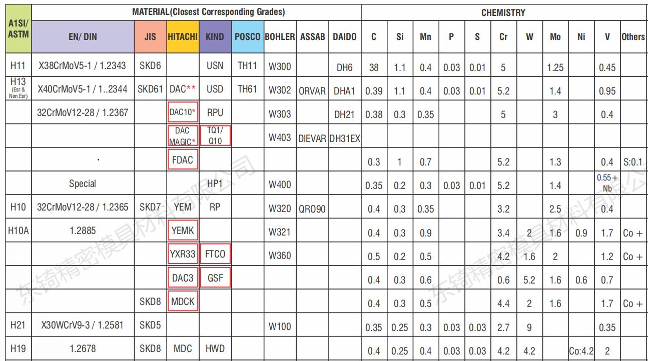 以下是常用熱鍛模具材料各國(guó)對(duì)照表(包含材料化學(xué)成分)。