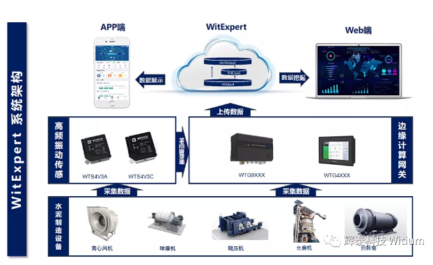 通過邊緣計算網(wǎng)關(guān)對數(shù)據(jù)進行分析,并把數(shù)據(jù)上傳到WitCloud物聯(lián)網(wǎng)數(shù)據(jù)云平臺,利用WitExpert機理模型、機器學(xué)習(xí)及人工智能的算法故障診斷工具,根據(jù)實時采集的數(shù)據(jù)進行分析處理,實現(xiàn)水泥行業(yè)設(shè)備不平衡、不對中、松動、齒輪磨損、軸承老化等故障的預(yù)測及診斷。最終反饋到WitExpert-Web/App用戶平臺,為用戶提供水泥現(xiàn)場設(shè)備的在線監(jiān)控、頻譜分析、故障告警、維修建議、健康診斷報告等服務(wù)。
